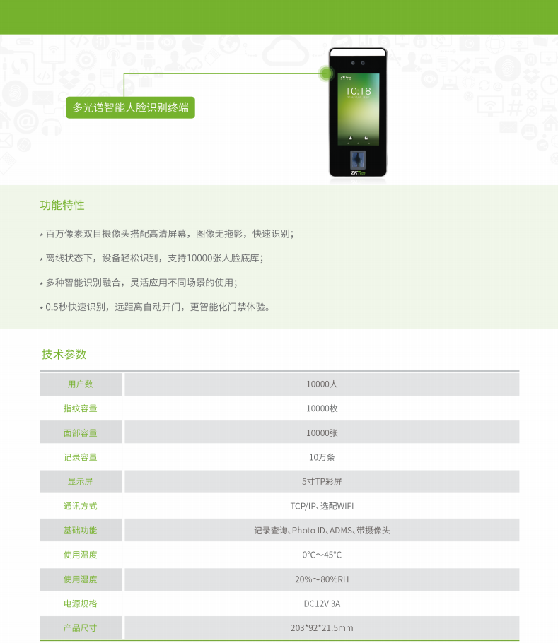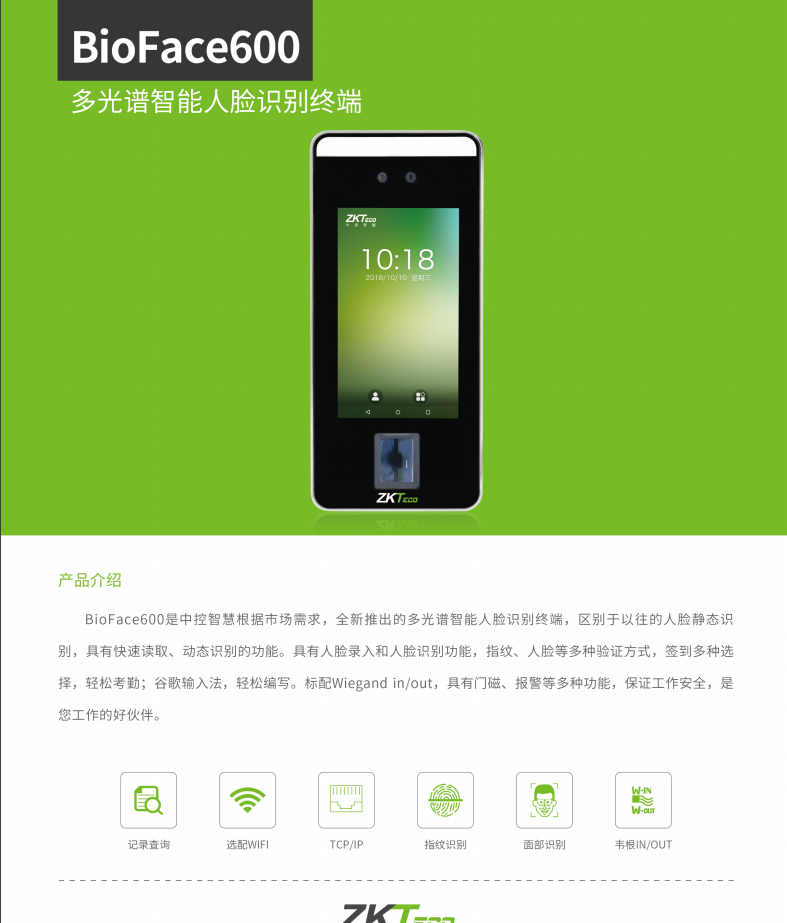 BioFace系列是中控智慧根據市場需求,全新推出的多光譜智能人臉識別終端,區別于以往的人臉靜態識別,具有快速讀取、動態識別的功能。BioFace具有人臉錄入和人臉識別功能,指紋、人臉等多種驗證方式,簽到多種選擇,輕松考勤;谷歌輸入法,輕松編寫。標配Wiegand in/out,具有門磁、報警等多種功能,守護您工作安全。